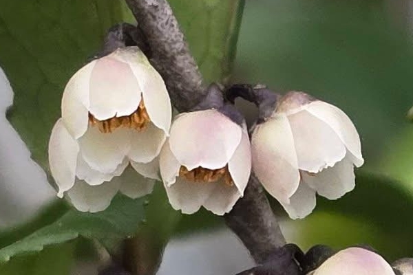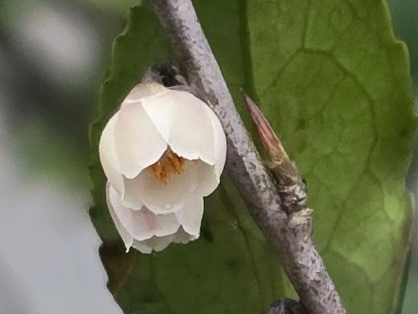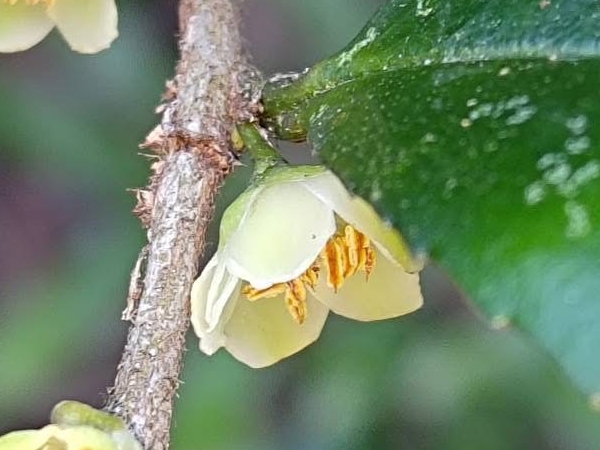 ![]() 上面照片:潘玉郎拍攝 (上面是雄株和雄花的照片;花單性,雌雄異株;花單生或2~3朵簇生於葉腋,花梗約與花苞等長或略短;花瓣5枚,白色,有濃郁香味;雄花雄蕊約15枚,無雌蕊;雌花雌蕊3叉,無雄蕊) |
