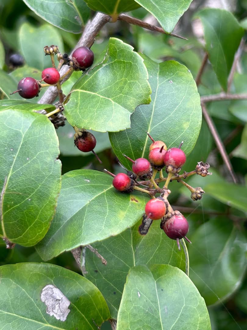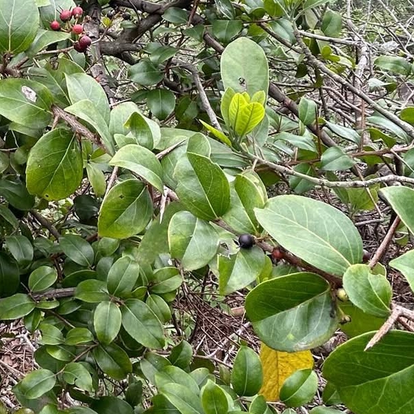 (原生種;世界植物在線標示原生於中國大陸至馬來西亞;台灣物種名錄標示為原生種,原生於金門;常綠小喬木;單葉互生,卵形至橢圓形,淺鋸齒緣,側脈4~5對,葉基兩側具腺體,葉腋常具有長刺;總狀花序,頂生;花瓣5~6枚,白色至淡黃色;雄蕊多數,細長;漿果球形,徑約0.5公分,成熟紅色至紫黑色,花柱宿存)