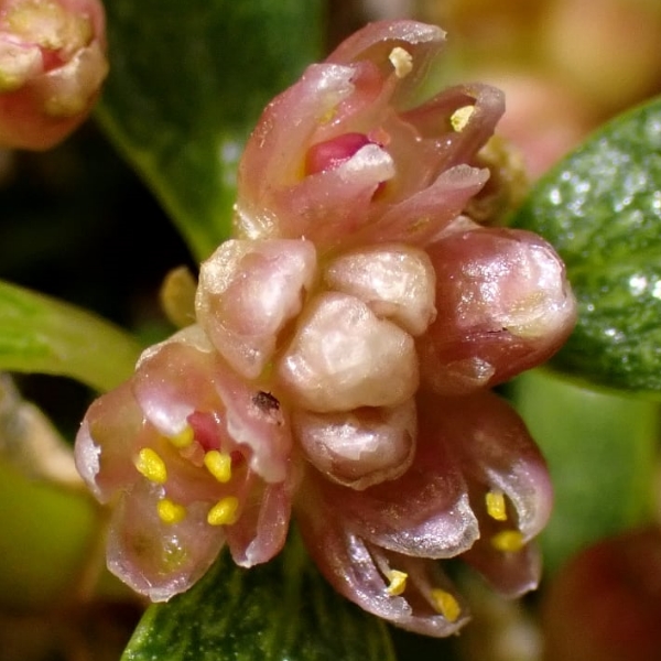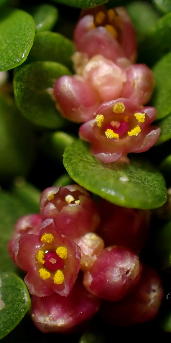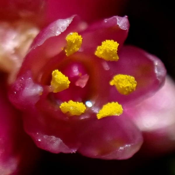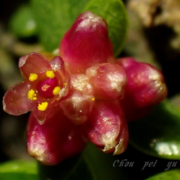 ![]() 上面照片:周佩玉拍攝 (現花被片6枚;花被片通常5枚,粉紅色至桃紅色,肉質;雄蕊5枚,花藥鮮黃色;雌蕊花柱2叉) |