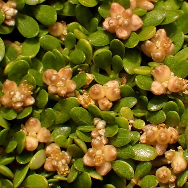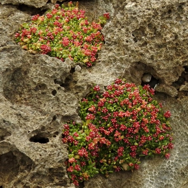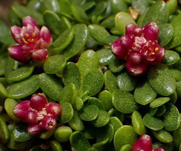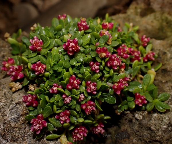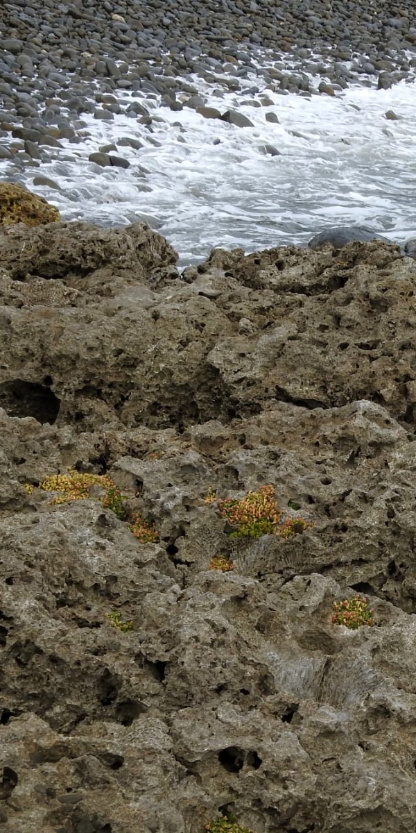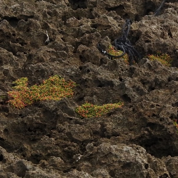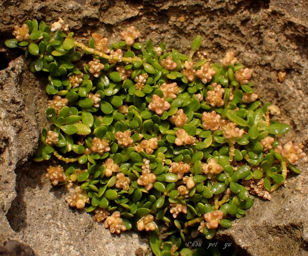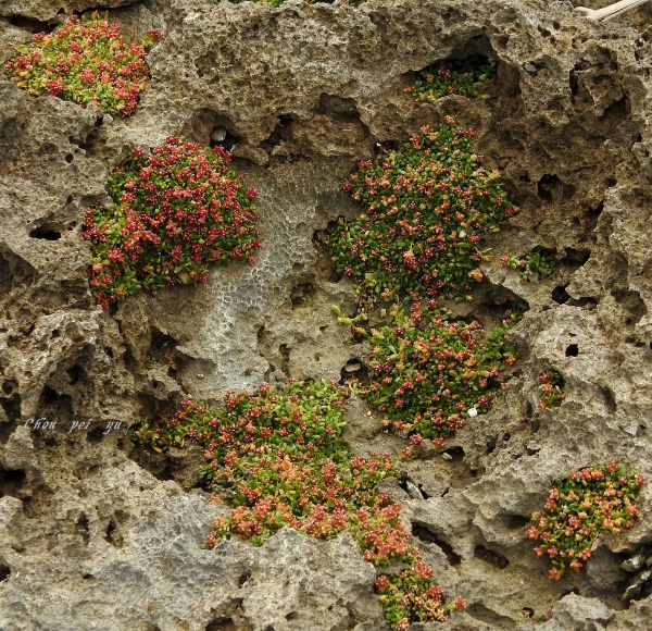 ![]() 上面照片:周佩玉拍攝 (匍匐性草本;多生在海濱岩石上;單葉對生,倒卵形至倒長卵形,全緣,肉質,短於1公分;頭狀花序,頂生;花被片5枚,粉紅色至桃紅色,肉質) |