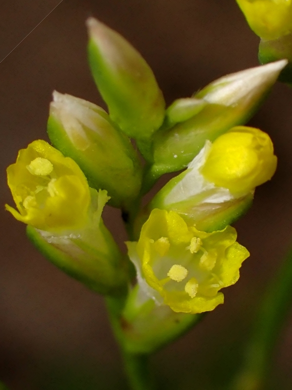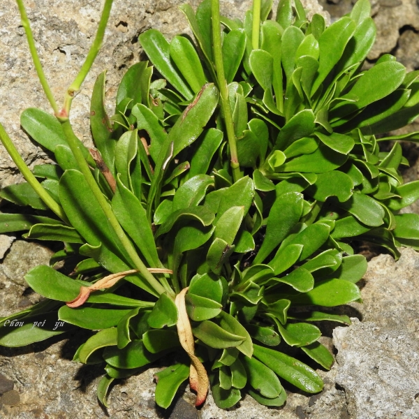 (台灣特有種;世界植物在線 POWO 標示原生地只產於台灣;台灣物名錄查無此學名及中文名;多年生草本;短莖黑色(烏色);單葉叢生,倒披針形,全緣;圓錐花序,頂生,花莖直立抽高狀;小花序穗狀;花瓣5枚,黃色;花萼漏斗狀,5淺裂,白色,宿存)