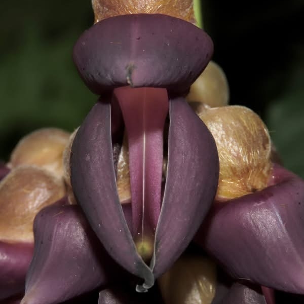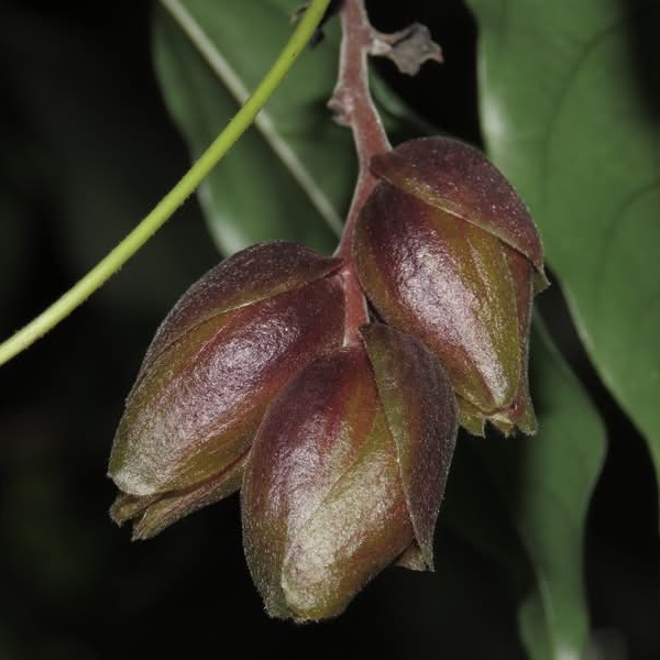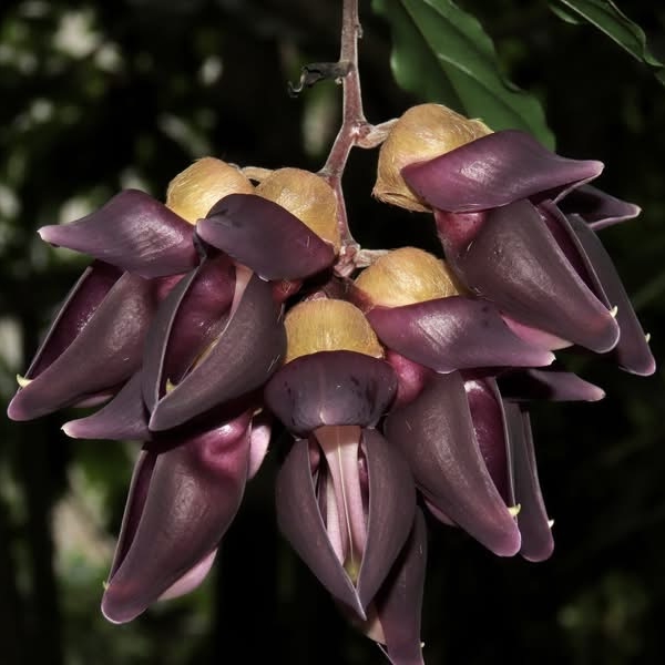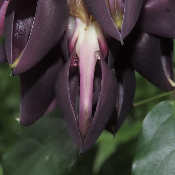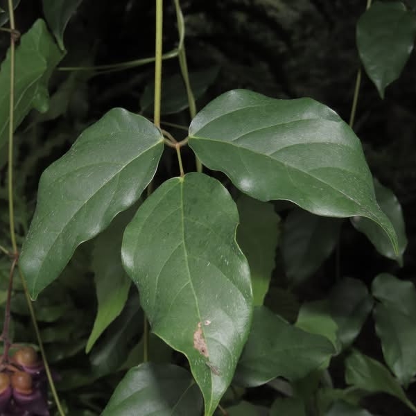 (栽培種;世界植物在線 POWO 標示原於中國大陸至中南半島一帶;台灣物種查無此學名及中文名;纏繞性木質藤本;右旋纏繞;三出複葉,互生;小葉歪卵形,兩面無毛或具很稀疏的毛;葉柄和葉脈被疏毛;總狀花序,腋生;花冠蝶形,紫紅色至紫黑色;花萼密被伏貼褐色毛;與蘭嶼血藤極為相似)