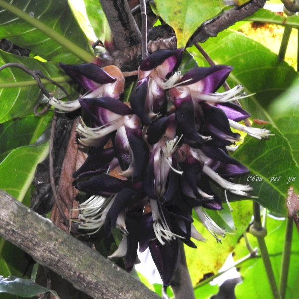 ![]() 上面照片:周佩玉拍攝於台大校園 (總狀花序,腋生;花冠蝶形,紫紅色至紫黑色) |