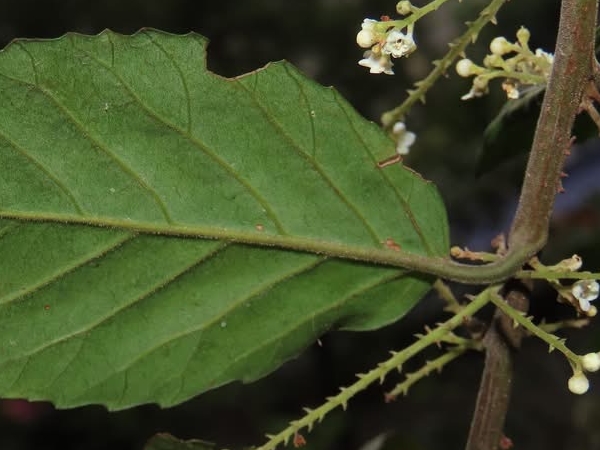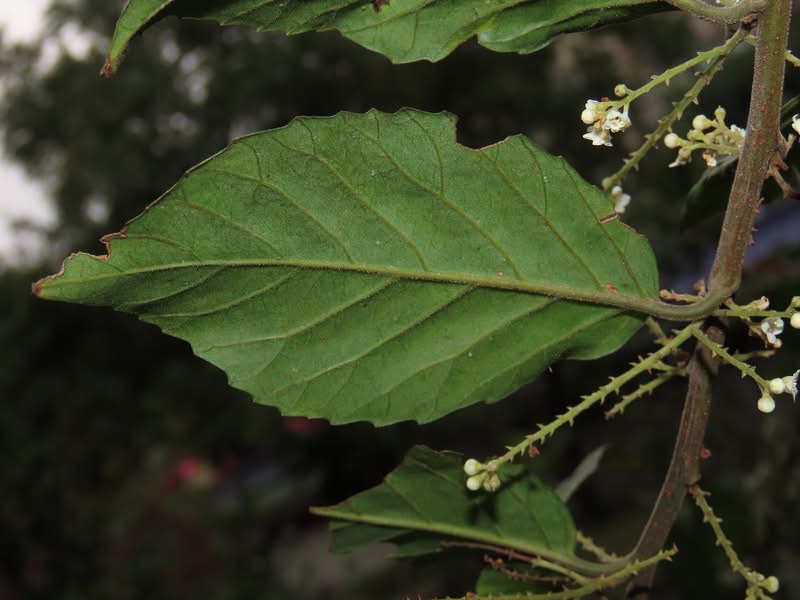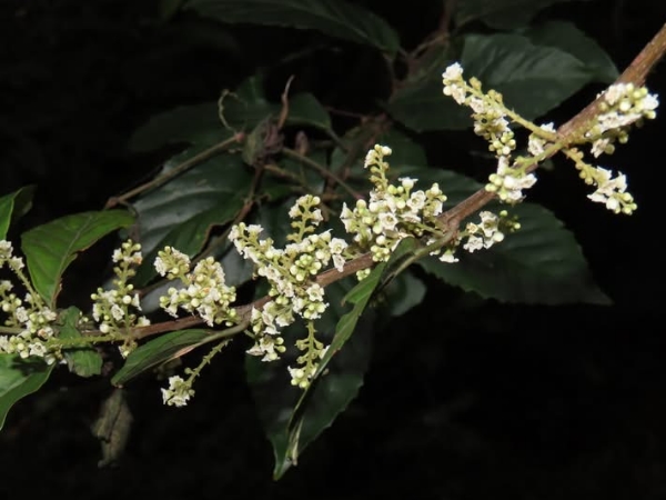 (原生種;原生於台灣、中國大陸至中南半島一帶;台灣物種名錄標名鯽魚膽;灌木;莖條、葉背、花序和幼果密被細毛;單葉互生,長橢圓形,鋸齒緣;總狀花序排列成圓錐花序;果實球形,被毛)