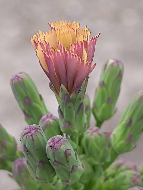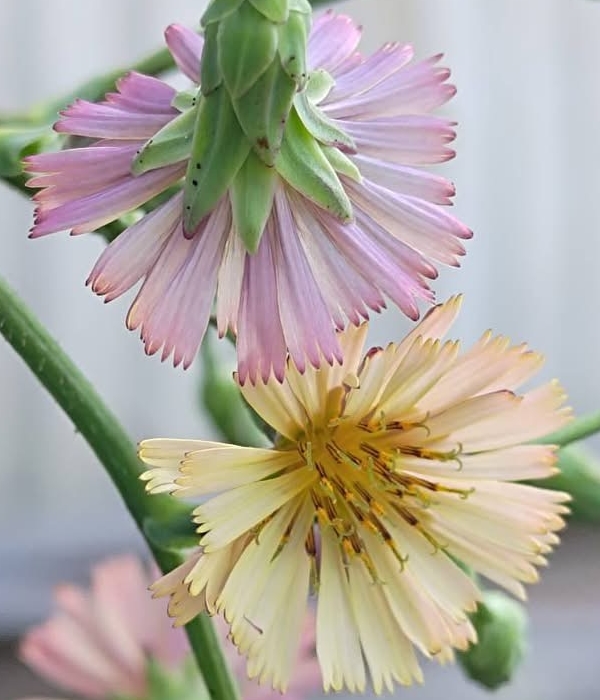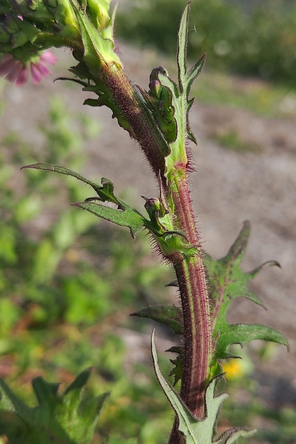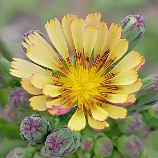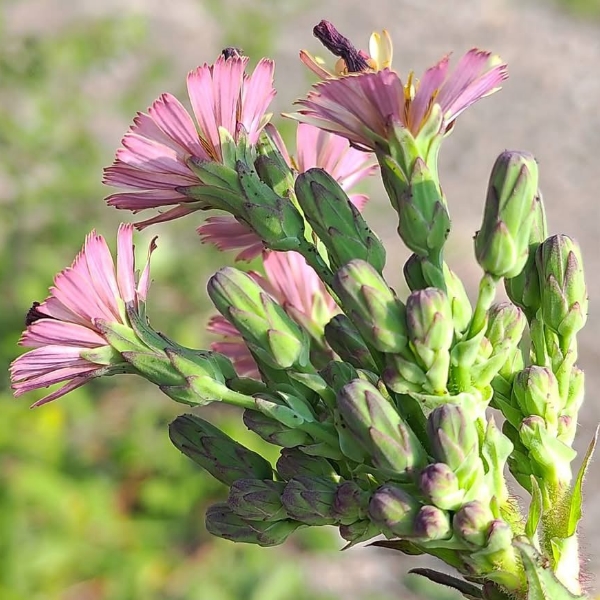 (原生種;原生於台灣和中國大陸;台灣物種名錄標名台灣山苦藚,別名台灣山萵苣,附有照片;維基百科標名台灣翅果菊,別名台灣山苦蕒;二年生直立草本;高度可達1公尺以上;莖常呈紫色;全株被毛;單葉互生,不規則羽裂狀,葉面常散布紫斑;頭狀花序(頭花)呈繖房或總狀排列;花冠淺黃至紫紅色;舌狀花多層,先端5齒裂;總苞筒狀,苞片多層,覆瓦狀排列,先端呈紫色;花謝之後,總苞先端急縮呈尖錐狀;瘦果黑色,扁平,具白色冠毛)