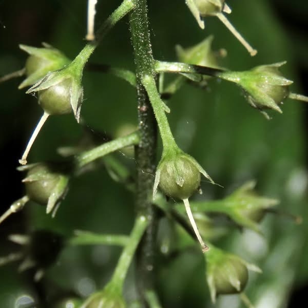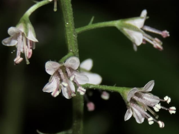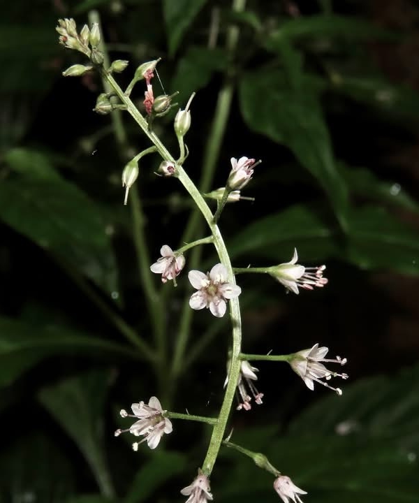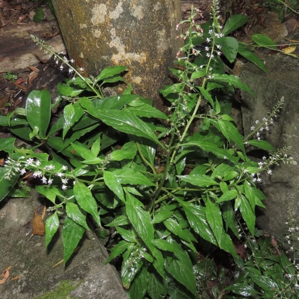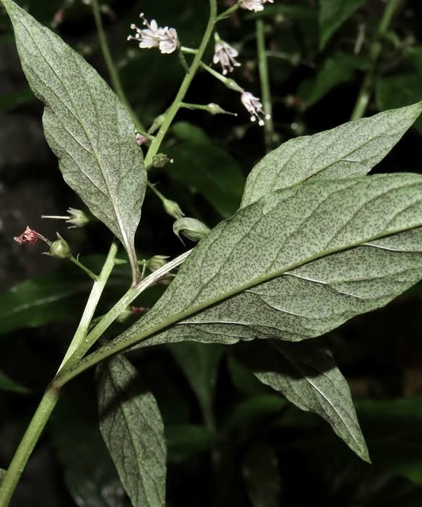 (原生種;原生於台灣、日本至中南半島一帶及印尼;一年生草本;莖直立;單葉互生,長卵形、橢圓形至倒披針形;葉背灰綠,具褐色腺斑;總狀花序,頂生,小花具長梗;花瓣5枚,白色至淡粉紅色;蒴果球形,花柱宿存)
