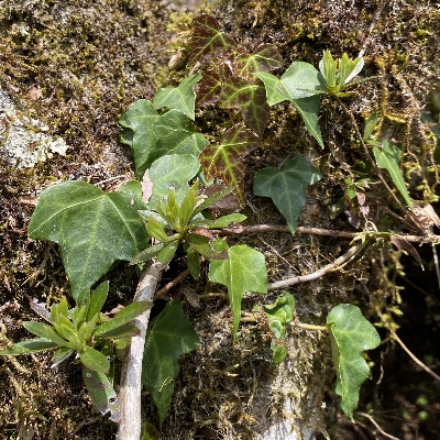 (Hedera) ==台灣原生種== ●台灣常春藤(Hedera rhombea var. formosana) (台灣特有種;灌木;以氣生根攀緣他物而生;莖枝分為營養枝和生殖枝;營養枝上的葉子呈掌狀,3~5裂;生殖枝上的葉子呈卵形至卵狀披針形,通常不裂;繖形花序頂生,排列成圓錐狀;核果成熟為黑褐色) |