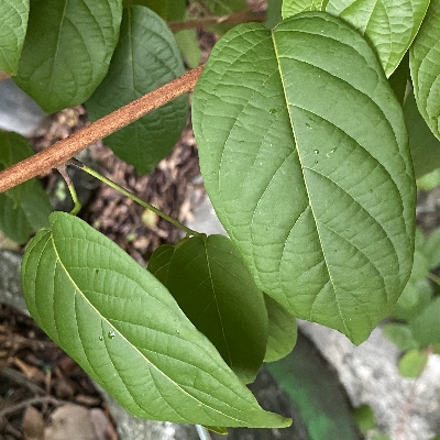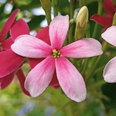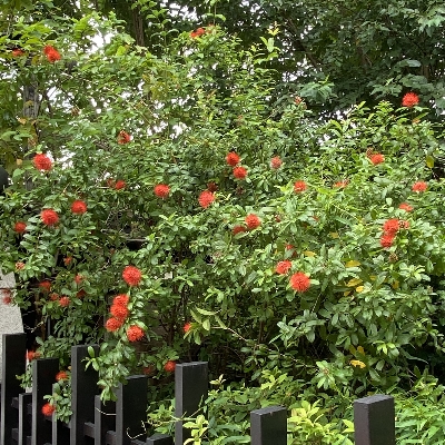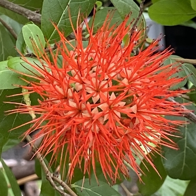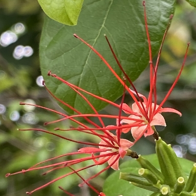 (栽培種;台灣物種名錄查無此學名及中文名;維基百科標名泰國粉撲藤;半蔓性灌木;單葉對生或輪生,橢圓形;短穗頭狀花序;花萼淺橘色,5枚,較花瓣大;花瓣橘紅色,5枚,較小;花蕊細長,紅色;核果橄欖狀,5稜,似楊桃) •卵葉藤訶子(Combretum ovalifolium、Quisqualis ovalifolium) (栽培種) |