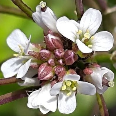 (薺讀計) ==台灣原生種== ●蔊菜(Cardamine occulta、焊菜、碎米薺) (原生種;原生於台灣、日本、中國大陸至印度和印尼一帶;世界植物在線 POWO 附有照片;台灣物種名錄標名蔊菜,別名焊菜;維基百科20260114查無中文名;中國植物智標名碎米薺;草本;自基部處多分枝;下部莖通常呈暗紫色;被短毛,被毛往植物體上部漸稀;奇數羽狀複葉,互生,小葉3~11枚;總狀花序,花朵甚小,4瓣,白色;雄蕊4枚,雌蕊柱頭單一;長角果,線形,內含種子約15枚;果實成熟,兩邊的果皮會快速由下往上卷,將種子和果皮彈射出去,進行自力傳播;其葉片可當野菜食用) •日本蔊菜(Cardamine nipponica、日本焊菜、日本碎米薺) (原生種;原生於台灣和日本;台灣物種名錄標名日本蔊菜,別名日本焊菜;維基百科標名日本碎米薺,別名日本焊菜,附有照片(照片中的花朵比蔊菜明顯大許多)) |