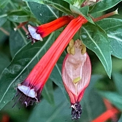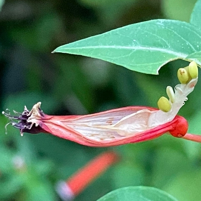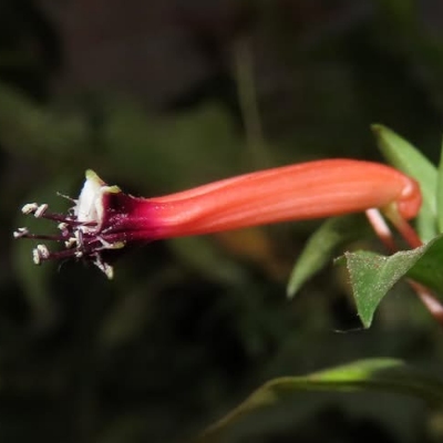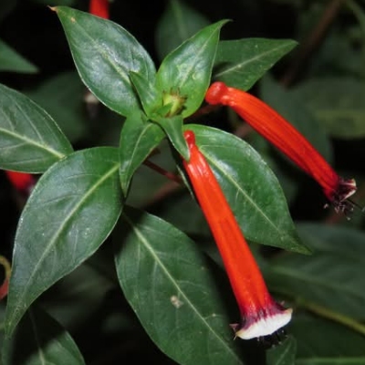 (Cuphea、萼距花屬) ==非台灣原生種== ●雪茄花(Cuphea ignea、紅丁香、火紅萼距花) (栽培種;台灣物種名錄標名雪茄花;維基百科標名火紅萼距花,萼距花屬;多年生草本或亞灌木,植株低矮,分枝多;單葉對生,橢圓形至卵狀披針形;花序單生葉腋,無花瓣,花萼筒狀,橘紅色,末端略開裂,有紫色環,口部白色,狀似雪茄,基部有花距) |