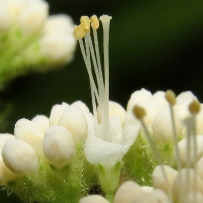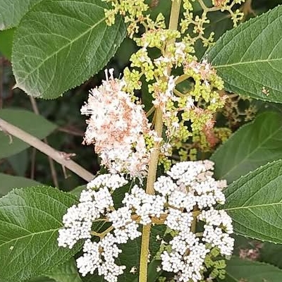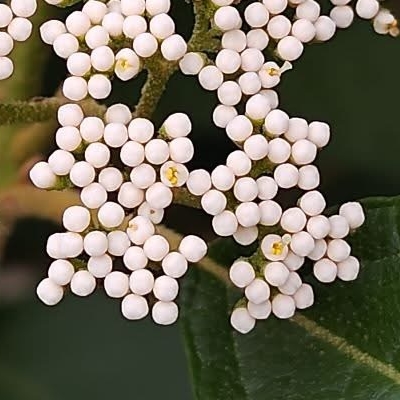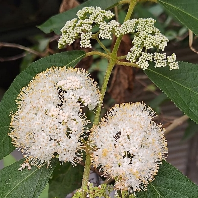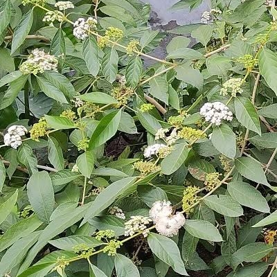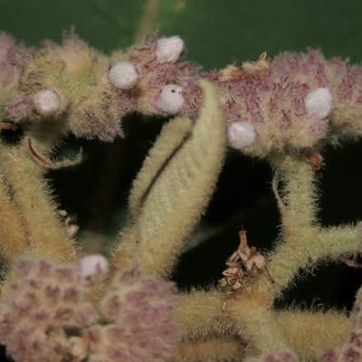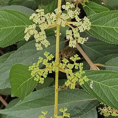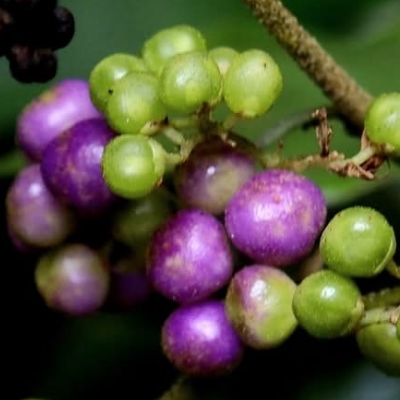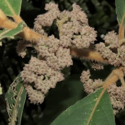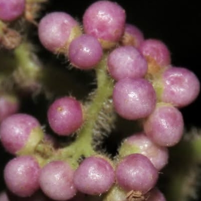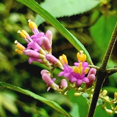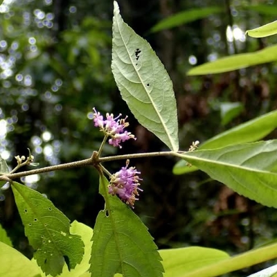 ●杜虹花(Callicarpa pedunculata、Callicarpa formosana var. formosana、Callicarpa formosana var. longifolia、Callicarpa formosana var. glabrata、台灣紫珠、粗糠仔、紅粗糠) (原生種;世界植物在線 POWO 標示 Callicarpa formosana = Callicarpa formosana var. longifolia = Callicarpa formosana var. glabrata = Callicarpa pedunculata,皆為有效學名,標示原生於台灣、中國大陸、中南半島、菲律賓至澳洲東部;台灣物種名錄將 Callicarpa formosana var. formosana 標名杜虹花,別名台灣紫珠(蘭嶼紫珠併入),標示為原生種,將 Callicarpa formosana var. longifolia 標名長葉杜虹花,標示為台灣特有種,將 Callicarpa formosana var. glabrata 標名六龜粗糠樹,標示為台灣特有種;半落葉灌木;株高約2~3公尺;主枝直立,側枝柔軟下垂狀;全株密被褐色柔毛,枝條並被茶褐色米糠樣鱗片,故有粗糠仔和紅粗糠之別名;單葉對生,長卵形至長橢圓形,細鋸齒緣;聚繖花序,腋生;花朵細小,管狀;杜虹花有紫色和白色兩種,紫花結紫果,白花結白果;核果球形,成熟紫色或白色) |