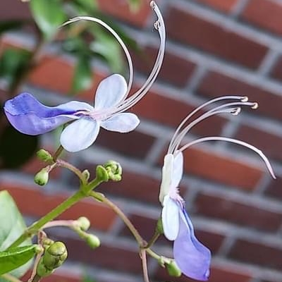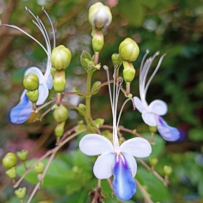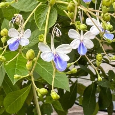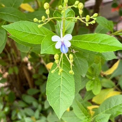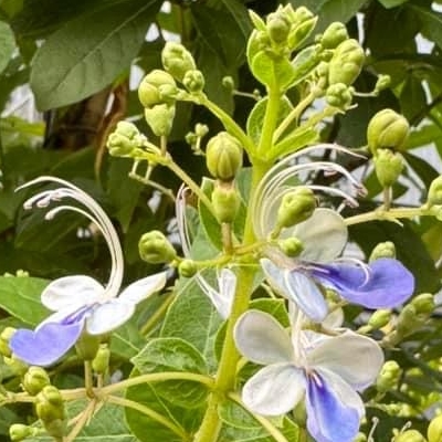 (Rotheca) ==非台灣原生種== ●藍蝴蝶(Rotheca myricoides、紫蝶花 、花蝴蝶) (栽培種;台灣物種名錄查無此學名及中文名;香港柴娃娃植物網和台北植物園皆標名藍蝴蝶,唇形科;灌木;單葉對生或3~4葉輪生,長橢圓形至倒長卵形,或卵形;圓錐花序,花瓣5枚,左右2對淺藍色,中瓣深藍色,雌雄蕊彎曲長伸,全花似蝴蝶) |