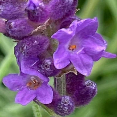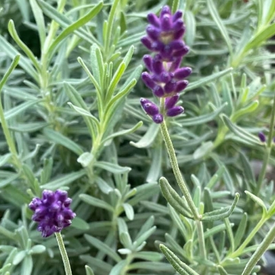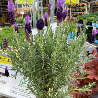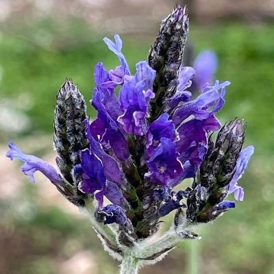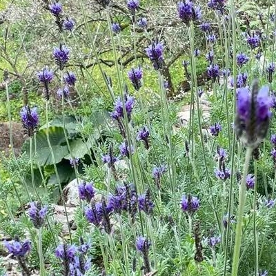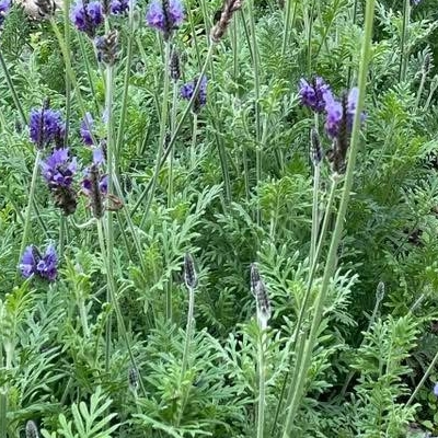 ●西班牙薰衣草(Lavandula stoechas、 法國薰衣草) (栽培種;原生於地中海附近一帶;世界植物在線 POWO 附有照片(相符);台灣物種名錄20260327查無此學名及中文名;中國植物智標名西班牙薰衣草,附有照片(相符);多年生草本或小灌木;單葉對生,線狀披針形,灰綠色;輪繖花序,苞片密集,於枝頂聚成穗狀花序;花序頂部著生幾個特化的苞片,狀似兔耳,紫色;花朵小形,從苞片中伸出,深紫色;堅果;全株具芳香) |