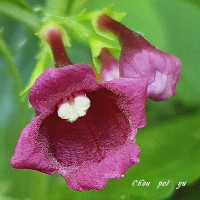 (Chelonopsis、Bostrychanthera) ==台灣原生種== ●毛葯花(Chelonopsis deflexa、Bostrychanthera deflexa、毛藥花) (原生種;原產於台灣和中國大陸;世界植物在線 POWO 標示 Bostrychanthera deflexa = Chelonopsis deflexa,皆為有效學名; 台灣物種名錄標名毛葯花;維基百科標名毛藥花;葯同藥;多年生直立草本或半灌木;單葉對生,狹橢圓形,鋸齒緣,近無柄;聚繖花序,腋生,每花序有花數朵;花冠紫紅色,漏斗狀,花藥上端具叢毛(名稱由來);子房4室,堅果4枚,球形,光滑,成熟紫黑色) |