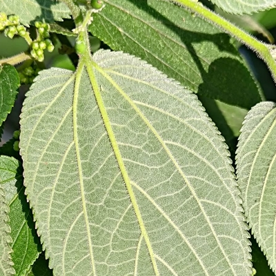 大麻科山黃麻屬 更多照片: 20250427_02 照片:林美燕拍攝 照片1、3:雌雄同株,具兩性花 照片:小枝和葉背葉脈密被直立的短柔毛 |