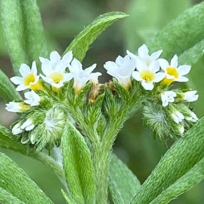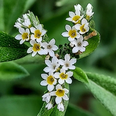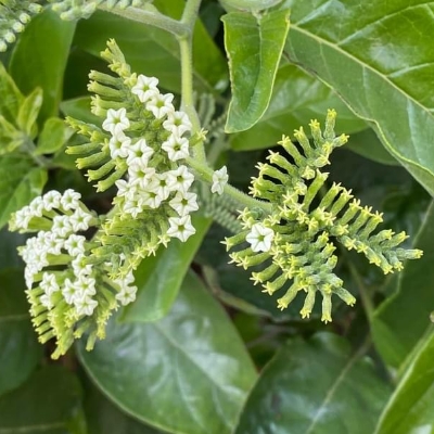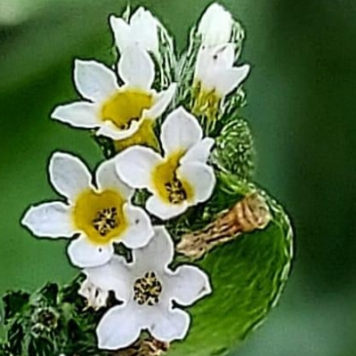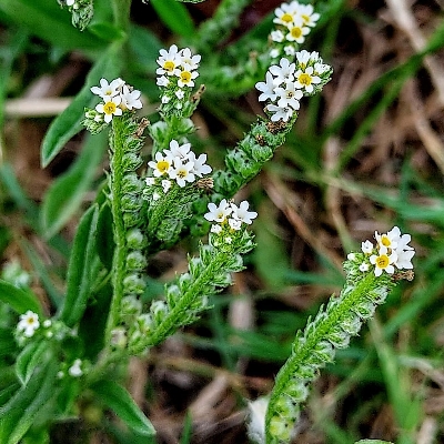 ●伏毛天芹菜(Heliotropium procumbens var. depressum) (歸化種) ●簇葉病伏毛天芹菜 •細葉天芹菜(Heliotropium strigosum) (原生種) ●冷飯藤(Heliotropium sarmentosum、台灣紫丹) (原生種;蔓性灌木;單葉互生,卵形、長卵形至橢圓形;聚繖花序,蠍尾狀;花瓣黃綠色至白色;核果球形,成熟白色) |