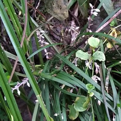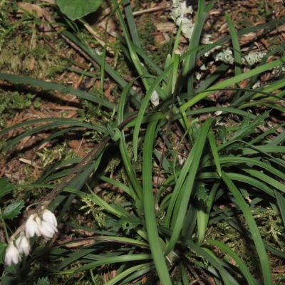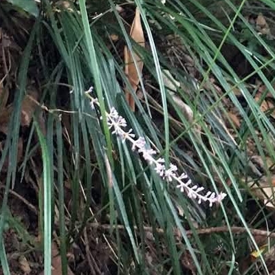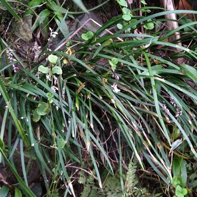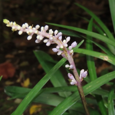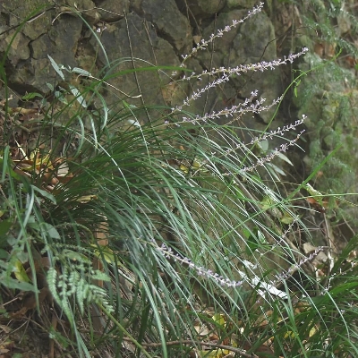 ●間型沿階草(Ophiopogon intermedius、長梗沿階草、扁柄沿階草、書帶草、沿階草) (原生種;台灣物種名錄標名間型沿階草,別名長梗沿階草、扁柄沿階草、玉龍草、書帶草、沿階草,附有照片;多年生草本;分布於中高海拔;具塊莖;單葉互生,基部叢生,線形,細鋸齒緣,寬約0.5公分,長可達50公分以上;總狀花序,腋生,葶狀,花朵小型,白色至紫色,花藥綠色;蒴果卵形,成熟紫黑色) |