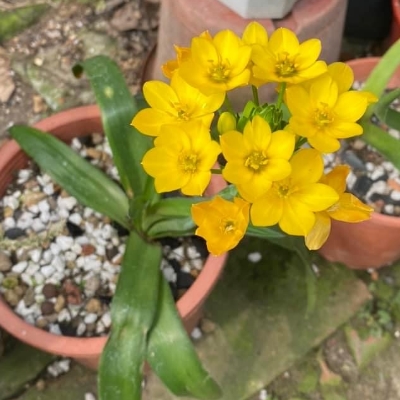 (栽培種;台灣物種名錄查無此學名及中文名;葉線形,彎曲狀;花色黃色,朝下;花瓣背面中間綠色) •寬葉彈簧草(Albuca concordiana) (栽培種;台灣物種名錄查無此學名及中文名) |