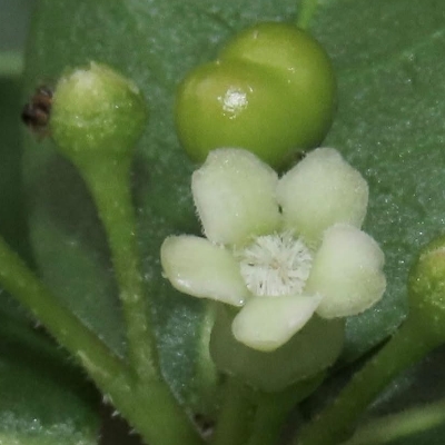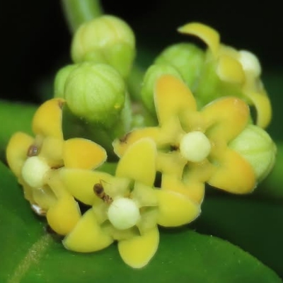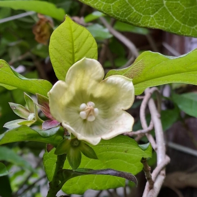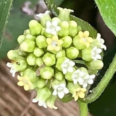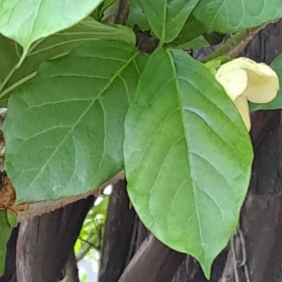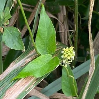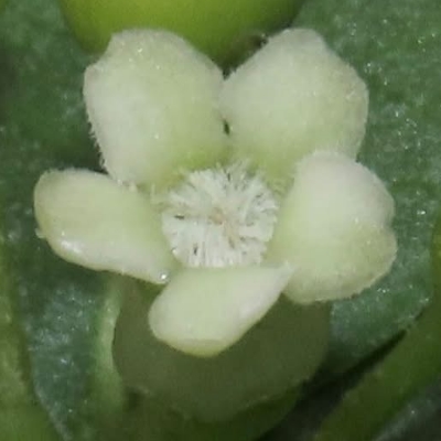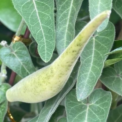 ●絨毛芙蓉蘭(Marsdenia tinctoria、藍葉藤、肖牛耳菜、肖牛耳藤) (原生種;台灣物種名錄標名絨毛芙蓉蘭;維基百科標名藍葉藤;莖蔓性;全株被細絨毛;單葉對生,卵形至卵狀披針形;聚繖花序,腋生,花莖小;花瓣白色,熟時轉黃;蓇葖果單生或對生,密被絨毛) | ||