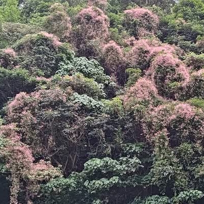 ●酸藤(Urceola rosea) (原生種;藤莖粗壯,狀似蠎蛇盤旋樹幹上;單葉對生,長橢圓形;總狀花序排成圓花序,花多而密集;花冠粉紅色;蓇葖果,圓條形,對生,成直角;種子先端具絲狀毛;五六月盛花期,常覆蓋山林,滿樹紅光;藥草界稱之白椿根) | ||