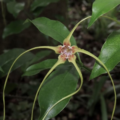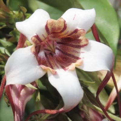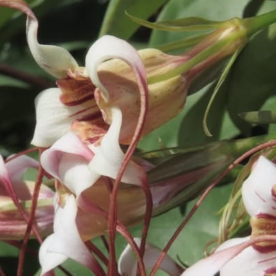 ==非台灣原生種== ●垂絲羊角拗(Strophanthus preussii、垂絲金龍藤) (栽培種;原生於西非和中非;台灣物種名錄查無此學名及中文名;香港柴娃娃植物網標名垂絲羊角拗;蔓性灌木;單葉對生, 橢圓形至長橢圓形,全緣;聚繖花序,頂生;花冠筒狀,花瓣5裂,白色帶紅色,先端延長成絲狀,紅色,長度可達30公分以上;花萼5枚,披針形;蓇葖果,對生;有強烈毒性) |