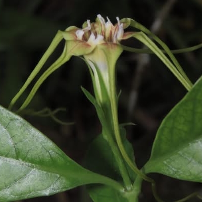 (Ceropegia、臘泉花屬) ==非台灣原生種== ●愛之蔓(Ceropegia woodii) (栽培種;匍匋地面或懸垂生長;葉對生,心形;花冠紫黑色;果實為線形之蓇葖果;成熟植株葉腋易長小塊莖(零餘子),可作繁殖) |