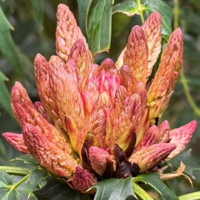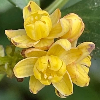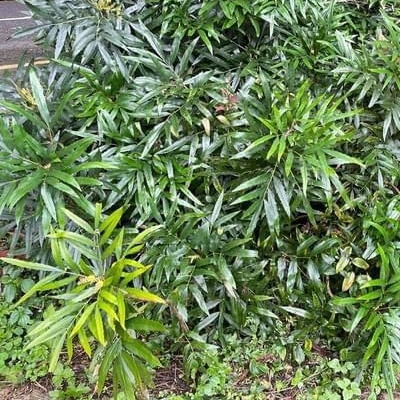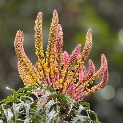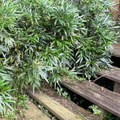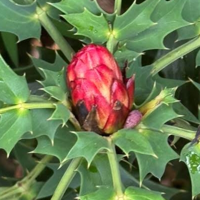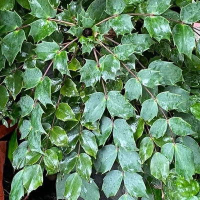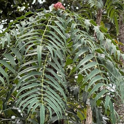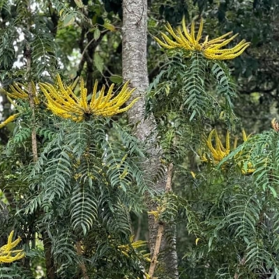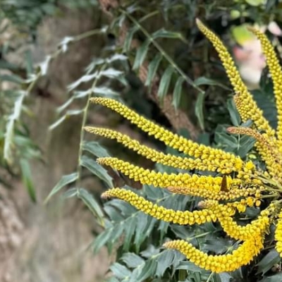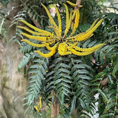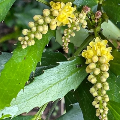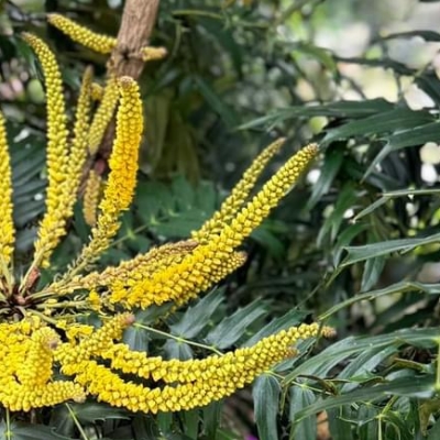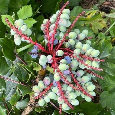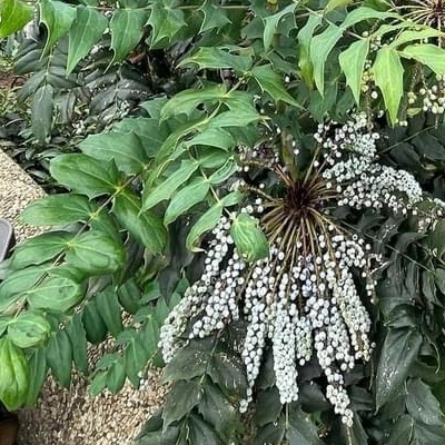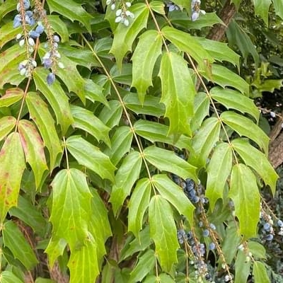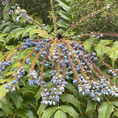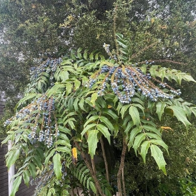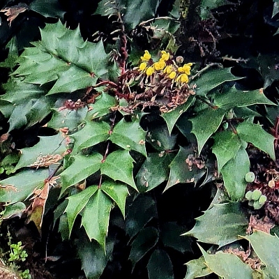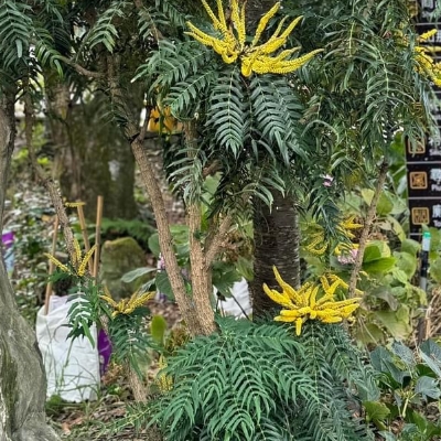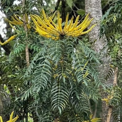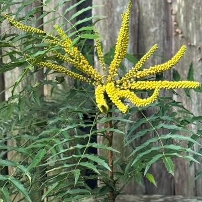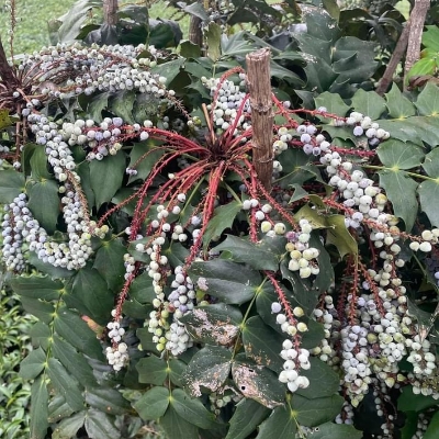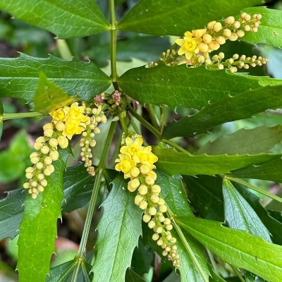 ●阿里山十大功勞(Berberis oiwakensis、Mahonia oiwakensis、Mahonia morrisonensis、Mahonia oiwakensis subsp. lomariifolia、Mahonia lomariifolia、玉山十大功勞、翠峰十大功勞、追分十大功勞、長小葉十大功勞) (原生種;原生於台灣、中國大陸和緬甸;世界植物在線 POWO 標示 Mahonia oiwakensis subsp. lomariifolia = Mahonia morrisonensis = Mahonia oiwakensis = Berberis oiwakensis,皆為有效學名,附有照片(小葉可達19對);台灣物種名錄將 Mahonia oiwakensis 標名阿里山十大功勞,別名翠峰十大功勞(又名追分十大功勞,追分是翠峰的舊地名),附有照片,標示為台灣特有種;將 Mahonia morrisonensis 標名玉山十大功勞,標示為台灣特有種;灌木;植株高度可達3公尺以上;奇數羽狀複葉,互生,叢生枝端;小葉對生,15~37枚,長卵形至披針形,鋸齒緣(尖刺狀);總狀花序,腋生,花序甚長,花多而密集;花瓣黃色,微張,整朵花包成球狀;漿果卵形,成熟紫藍色,被白粉) |