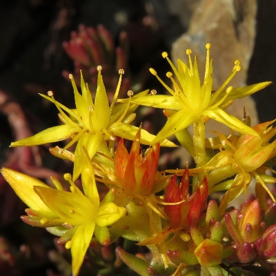 (Sedum、景天屬、萬年草屬) ==台灣原生種== ●火焰草(Sedum stellariifolium) (原生種) ●大葉火焰草(Sedum drymarioides) (原生種) •杉葉佛甲草(Sedum cryptomerioides) (台灣特有種) ●台灣佛甲草(Sedum formosanum、石板菜) (原生種;台灣物種名錄標名台灣佛甲草,別名石板菜,附有照片;維基百科標名台灣佛甲草;海濱植物;一年生草本;單葉互生,匙形至倒卵形,全緣,肉質;聚繖花序,頂生;花瓣5枚,黃色;花萼5枚,不等長;果實5枚,直立狀;種子黃色) •台灣佛甲草(Sedum taiwanianum) (台灣特有種;台灣物種名錄標名台灣佛甲草,與石板菜的正名同名,容易混淆;兩者為不同物種,本種生於山上,不產於海濱;果實直立狀) ●玉山佛甲草(Sedum morrisonense) (台灣特有種;單葉互生,密生,橢圓形;聚繖花序,頂生;花瓣5枚,黃色) •高山佛甲草(Sedum taiwanalpinum) (台灣特有種) •阿里山佛甲草(Sedum arisanense) (台灣特有種) ●小萼佛甲草(Sedum microsepalum) (台灣特有種) •尖萼佛甲草(Sedum parvisepalum) (台灣特有種) •等萼佛甲草(Sedum triangulisepalum) (台灣特有種) ●能高佛甲草(Sedum nokoense) (台灣特有種;多年生草本;莖匍匐或斜生,分枝多,常呈紅色;單葉互生,倒卵形至倒長卵形,全緣,肉質;花朵單生葉腋;花瓣5枚,黃色;雄蕊10枚) |