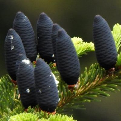 (Abies) ==台灣原生種== ●台灣冷杉(Abies kawakamii) (台灣特有種;雌雄同株異花,雌花序長橢圓形,直立朝上,雄花序穗狀) |