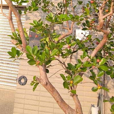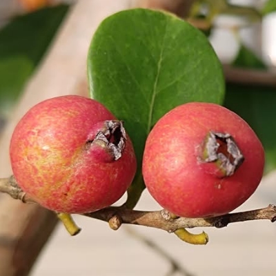 ●榕仔菝(Psidium cattleyanum) (栽培種;原生於南美洲東部;世界植物在線 POWO 附有照片;常綠小喬木;單葉對生,橢圓形,全緣,葉質像榕樹葉;花朵單生葉腋,花瓣5枚,白色,雄蕊多數;果實成熟紅色或黃色;紅色的俗稱草莓番石榴,黃色的俗稱檸檬番石榴) |