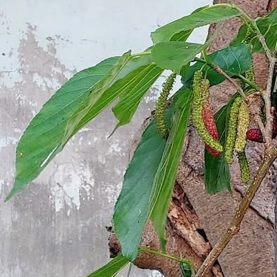 (Morus) ==台灣原生種== ●小葉桑(Morus australis、桑樹、台灣桑、小桑樹、蠶仔葉樹) (原生種;原生於台灣、日本至印度一帶;台灣物種名錄標名小葉桑;喬木或灌木;雌雄異株,偶見同株;葉形多變,卵形、心形至掌形,鋸齒緣;雄花為下垂的葇荑花序;雌花序呈橢圓形,花柱凸出,白色,先端2裂;聚合果,橢圓形,成熟紅色至紫黑色) |