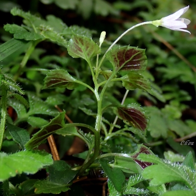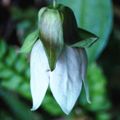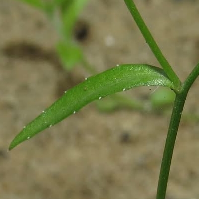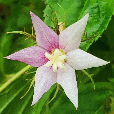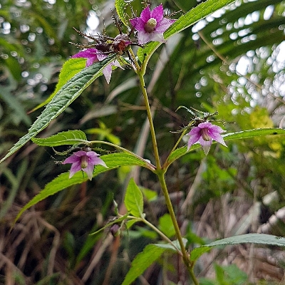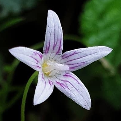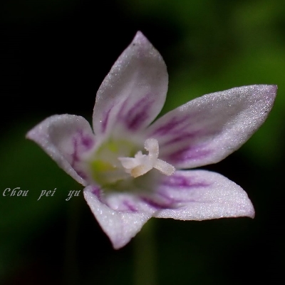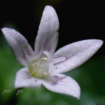 (Peracarpa、袋果草屬) ==台灣原生種== ●山桔梗(Peracarpa carnosa、袋果草、肉莢草) (原生種;原生於東北亞至南亞一帶;台灣物種名錄標名山桔梗;維基百科標名袋果草,別名山桔梗、肉莢草;多年生直立或匍匐性草本;具走莖;單葉互生,寬卵形,齒缺處有短刺;花朵單生葉腋,花瓣5枚,白色,基部或帶有紫色條紋,花梗細長;雌蕊柱頭3叉;果實倒長卵形) |