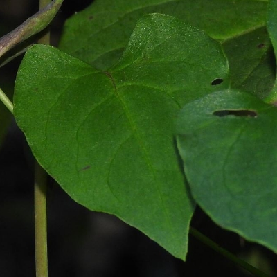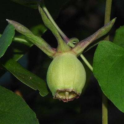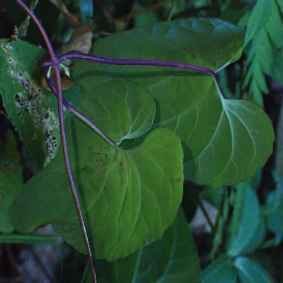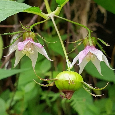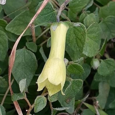 (Codonopsis) ==台灣原生種== ●金錢豹(Codonopsis javanica subsp. japonica) (原生種;亞種;原生於台灣、日本和中國大陸;纏繞性草本;莖纖細,右旋纏繞;單葉對生,心形,具長柄;花朵單生葉腋;花瓣5枚,黃白色,內側紫色;花萼5枚,披針形,位於果實下方;漿果倒卵形,成熟紫色) |