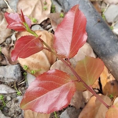 ==非台灣原生種== ●羅比梅(Flacourtia inermis、紫梅) (栽培種;台灣物種名錄標名羅比梅;灌木至小喬木,樹高可達4公尺;樹幹及枝條具有針刺,枝條伸長狀;單葉互生,卵形至橢圓形,疏鋸齒緣,春季時初發新葉紫紅色;雌雄異株,單性花或兩性花;總狀花序或聚繖花序,腋生,花序短;花柱4~6叉,無花瓣;核果球形或扁球形,成熟紅褐色,果徑約2~2.5公分,可食用) |