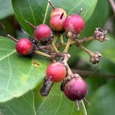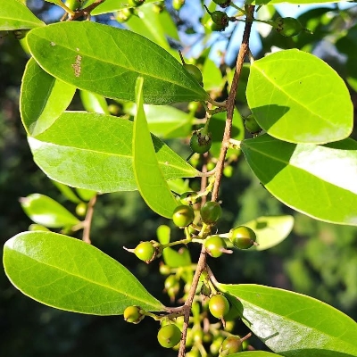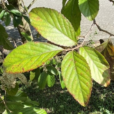 ●魯花樹(Scolopia oldhamii) (原生種;原生於台灣、中國大陸和菲律賓;喬木;幼株長滿棘刺;小枝無毛,偶具刺;單葉互生,橢圓形至倒長卵形,淺鈍鋸齒緣至全緣,新葉常呈紅褐色,葉基兩側常具腺體;總狀花序,腋生或頂生;花瓣5~6枚,白色至淺黃色;漿果卵形至橢圓形,成熟紫黑色,花柱宿存) | ||