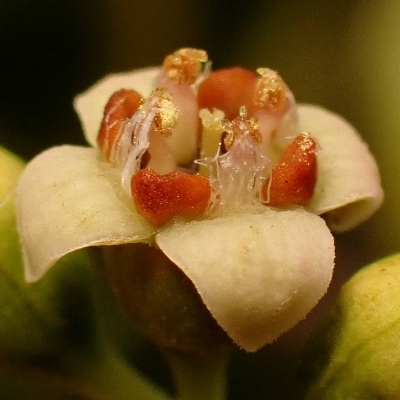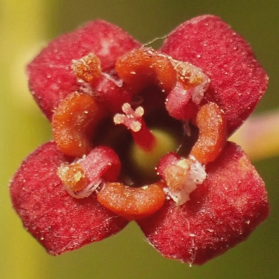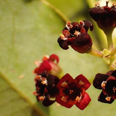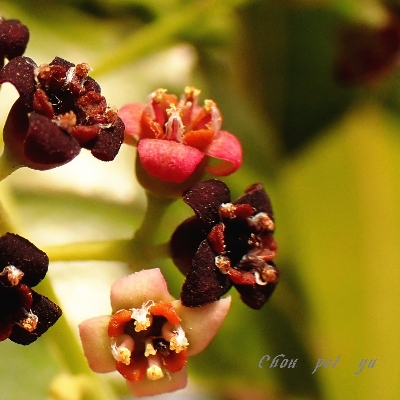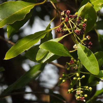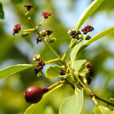 (Santalum) ==非台灣原生種== ●檀香(Santalum album、白檀、白銀香) (栽培種;常綠小喬木;單葉對生,長卵形、橢圓形至長橢圓形;花序頂生或腋生,呈聚繖花序或圓錐花序;花瓣4枚,初開黃白色,後轉紅色,再轉暗紅色;雄蕊4枚;花柱柱頭3裂或4裂;核果卵球形,成熟紫紅色至紫黑色) |