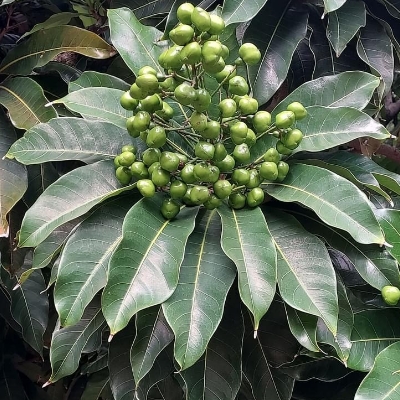 (Semecarpus、大果漆樹屬) ==台灣原生種== ●台東漆樹(Semecarpus longifolius、Semecarpus gigantifolius、Semecarpus gigantifolia、大葉肉托果、台東漆) (原生種;原生於台灣、菲律賓和印尼;世界植物在線 POWO 標示 Semecarpus gigantifolius = Semecarpus longifolius,皆為有效學名,附有照片;台灣物種名錄標名台東漆樹,別名台東漆,標示學名為 Semecarpus gigantifolia;維基百科標名大葉肉托果;常綠喬木;單葉互生,倒披針形,先端銳尖,葉柄長約5公分,葉長超過30公分(側脈可達15對以上),叢生枝端;圓錐花序,頂生;花雜性或雌雄異株;花瓣5枚(4~6枚),白色;雄蕊5枚,雌蕊3叉;核果卵形,具果托,成熟紫黑色;果托黃色至紅色;樹液有毒) |