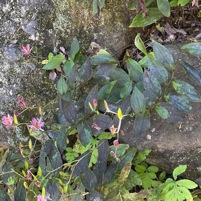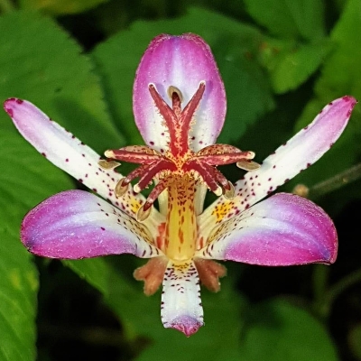 (Tricyrtis) ==台灣原生種== ●台灣油點草(Tricyrtis formosana、Tricyrtis formosana var. formosana) (台灣特有種;世界植物在線 POWO 標示 Tricyrtis formosana var. formosana = Tricyrtis formosana,皆為有效學名,附有照片;多年生草本;單葉互生,倒長卵形、橢圓形、卵形至卵狀披針形,常帶有墨綠色的油漬狀斑點,全緣,有柄、無柄至抱莖;聚繖花序,頂生;花被片6枚(內層3枚較窄,外層3枚較寬),粉紅色,散布紫紅色斑點;花距3枚,向外平伸,前端短分叉;雄蕊6枚,雌蕊花柱3叉,再分叉,花柱具乳突狀物;蒴果光滑,3角柱狀) |