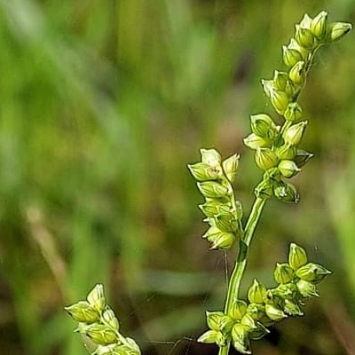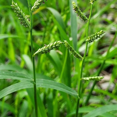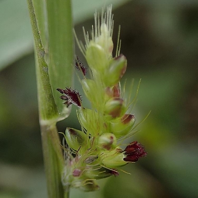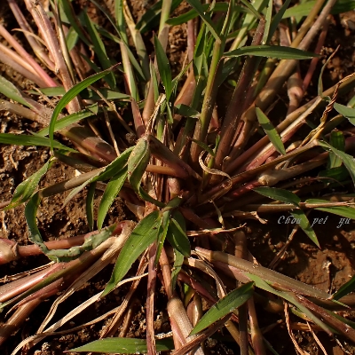 ●芒稷(Echinochloa colona、光頭稗、紅腳稗、光頭稗子) (原生種;稷讀計;原生於台灣、中國大陸至非洲、東南亞一帶台灣物種名錄標名芒稷,別名光頭稗,附有照片;維基百科標名光頭稗,別名芒稷,附有照片;一年生草本;莖稈傾臥,基部常呈紅色;單葉互生,線狀披針形;圓錐花序,頂生;穎果,卵形,平滑光亮,先端具小尖頭) |
