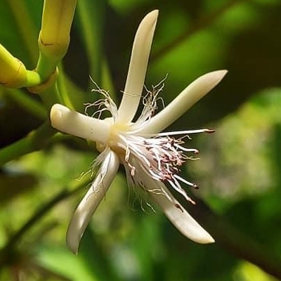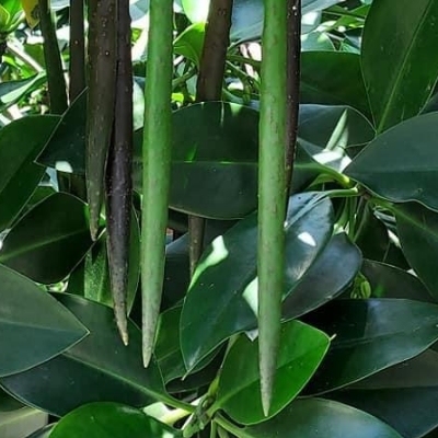 (Kandelia) ==台灣原生種== ●水筆仔(Kandelia obovata、秋茄樹) (原生種;原生於日本、台灣和中國大陸;維基百科標名秋茄樹;常綠灌木或小喬木;單葉對生,倒長卵形,全緣,厚革質,集生枝頂;二歧聚繖花序,腋生,有花4~10朵(或更多);花瓣5枚,白色,先端絲狀;花萼5枚,白色,線形,常被誤認為花瓣;雄蕊多數,柱頭3裂;果實卵形,褐色,花萼宿存;種子於果實未脫落時已萌發,綠色至褐色,棍棒狀,著地後長新苗,為胎生苗) |