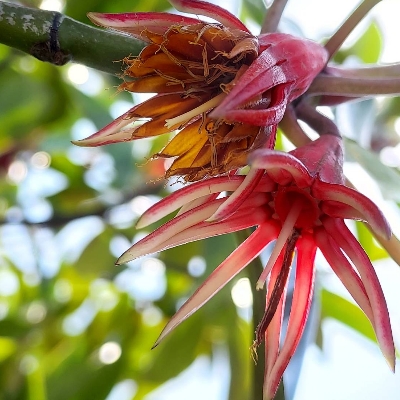 〉木欖屬 (Bruguiera) ==台灣原生種== ●紅茄冬(Bruguiera gymnorhiza、木欖、紅茄苳) (原生種;原生於中大陸至非洲和澳洲一帶有海岸之國家;台灣物種名錄標名紅茄冬,別名木欖、紅茄苳,附有照片;台灣紅皮書標示區域滅絕,可能是指紅茄冬曾在台灣消失過;目前於台南的台江沿海地區有復育的紅茄冬;常綠灌木至小喬木;單葉對生,長橢圓形,全緣,革質,具長柄,集生枝頂;花朵單生,腋生;萼筒紫紅色,花萼8~12枚,線狀披針形,紫紅色;花瓣與花萼同數,略短於花萼;雄蕊多數;胎生果,長圓柱形) |