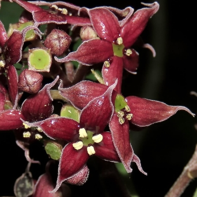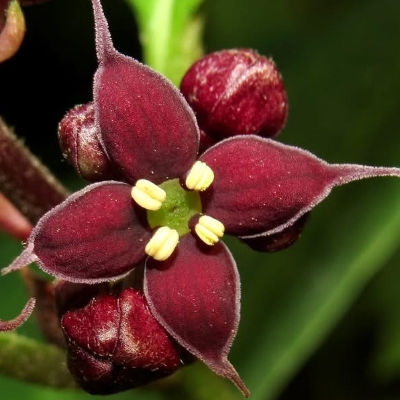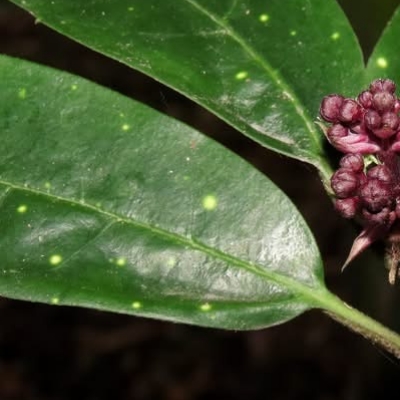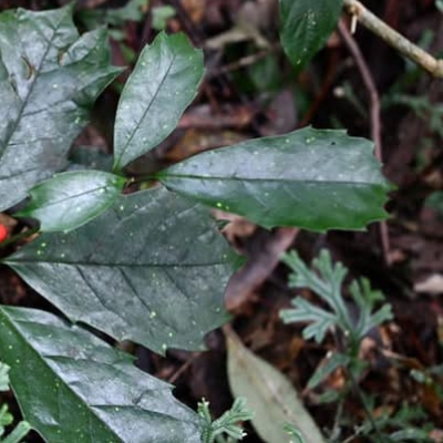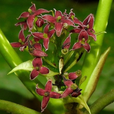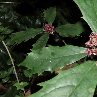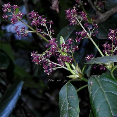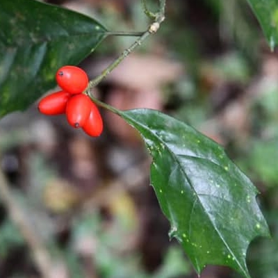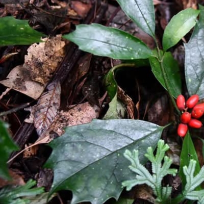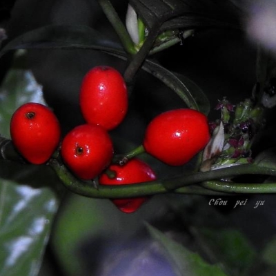 (原生種;原生於台灣、中國大陸至中南半島;常綠灌木,株高可達3公尺以上;單葉對生,長橢圓形至狹長橢圓形,鋸齒緣或全緣;花朵單性,雌雄異株;圓錐花序,頂生;花瓣4枚,深紫色,瓣端長尾狀;漿果卵形至橢圓形,成熟紅色) •鳳凰山珊瑚(Aucuba chinensis var. fongfangshanensis) (台灣特有種) |
