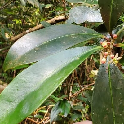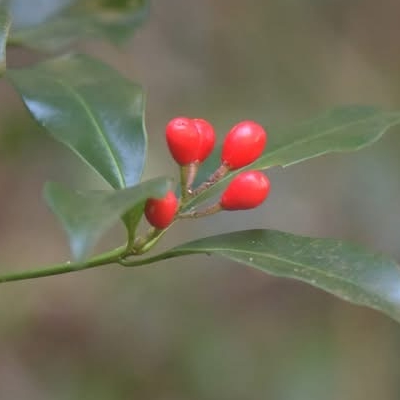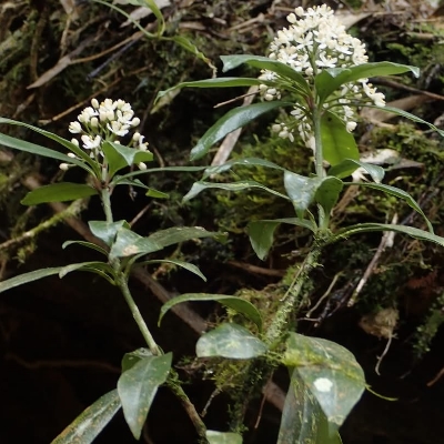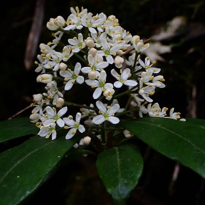 ●阿里山茵芋(Skimmia arisanensis) (台灣特有種;常綠灌木;單葉互生,長橢圓形至倒披針形,全緣;花序頂生,花瓣4枚或5枚,花單性或雜性;核果圓形,成熟紅色) | |