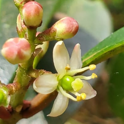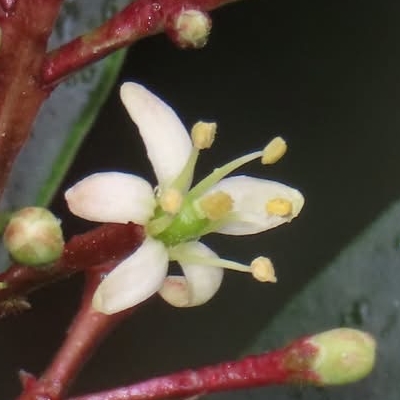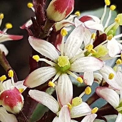 (原生種;台灣物種名錄附有照片,別名深紅茵芋;常綠灌木;單葉互生,長橢圓形至倒披針形,全緣;花序頂生,花瓣5枚,白色,帶紫紅色;雄蕊5枚,前端彎曲;核果