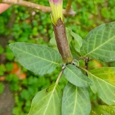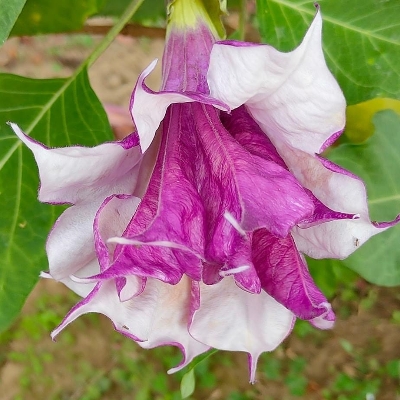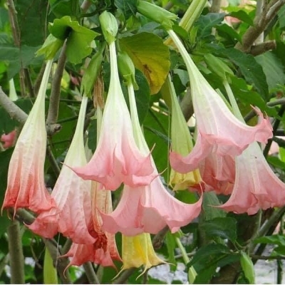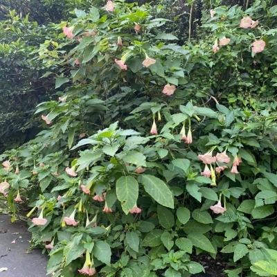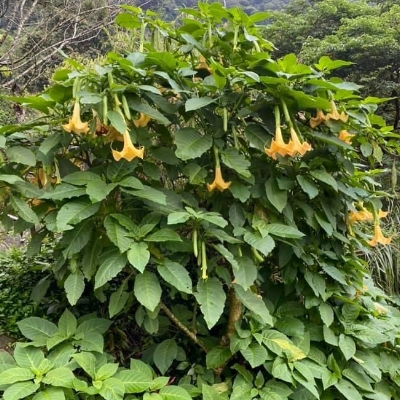 ●黃花木曼陀羅(Brugmansia aurea) (歸化種;原生於南美洲北部的哥倫比亞和厄瓜多;世界植物在線 POWO 附有照片(相符);台灣物種名錄查無此學名及中文名;中國植物智標名黃花木陀羅(橙黃色,相符);菁芳園綠生活標名金大花曼陀羅,別名黃花曼陀羅、大金花曼陀羅;常綠灌木;高度可達5公尺(或更高);單葉互生,長橢圓形,全緣;花冠喇叭狀,下垂,長度約25公分) | ●粉花木曼陀羅(Brugmansia insignis) (歸化種;原生於南美洲哥倫比亞至玻利維亞一帶;世界植物在線附有照片(相符);台灣物種名錄查無此學名及中文名;中國植物智標名粉花木曼陀羅,附有照片(粉紅色、相符);常綠灌木;單葉互生,長橢圓形,全緣;花冠喇叭狀,下垂,長度約25公分) | |