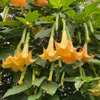 (Brugmansia、木曼陀羅屬) ==非台灣原生種== ●大花曼陀羅(Brugmansia suaveolens、大花木曼陀羅、巴西曼陀羅) (歸化種;原生於南美洲的東部一帶;世界植物在線附有照片(橙色花);維基百科附有照片(橙色花);中國植物智標名大花木曼陀羅,別名巴西曼陀羅,附有照片(白色、相符);常綠灌木;高度可達5公尺(或更高);單葉互生,長橢圓形,全緣;花冠喇叭狀,下垂,長度約25公分,有白、黃、橙、粉紅等色;花萼長筒狀;雌蕊柱頭2叉;蒴果,罕見結果) |