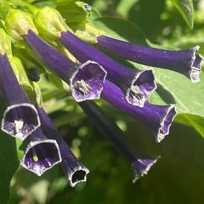 (Iochroma) ==非台灣原生種== ●長筒藍曼陀羅(Iochroma cyaneum、紫鈴花、紫丁花、小花垂筒藍曼陀羅、藍曼陀羅) (栽培種;台灣物種名錄查無此物種學名及中文名;常綠灌木;樹高可達3公尺;葉緣波浪狀;花冠長筒狀,花色多種) |