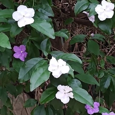 (Brunfelsia) ==非台灣原生種== ●變色茉莉(Brunfelsia uniflora、Brunfelsia hopeana、番茉莉、鴛鴦茉莉、雙色茉莉) (栽培種;原生於南美洲巴西附近一帶;世界植物在線 POWO 標示 Brunfelsia hopeana = Brunfelsia uniflora,皆為有效學名,附有照片(相符);台灣物種名錄將 Brunfelsia uniflora 標名變色茉莉,附有照片;將 Brunfelsia hopeana 標名番茉莉;維基百科標名變色茉莉;灌木;高度可達3公尺(或更高);枝條柔細,常呈下垂狀;單葉互生,倒長卵形至長橢圓形,全緣;花朵單生,腋生;花瓣5枚,初開紫色,後轉淺紫,最終變為白色後凋謝;花萼筒狀,花冠筒可達2.5公分;蒴果卵形,台灣栽培罕見結果;因花朵氣味接近茉莉花而得名;有資料寫說全株具有毒性,尚待查證) |
