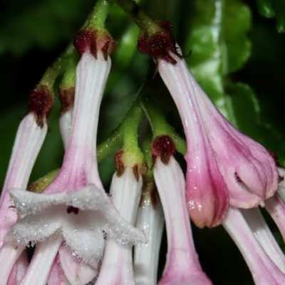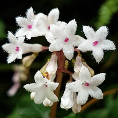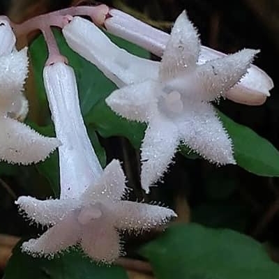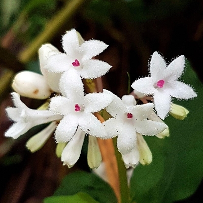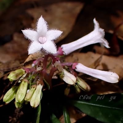 (Ophiorrhiza) ==台灣原生種== ●蛇根草(Ophiorrhiza japonica、日本蛇根草) (原生種;原生於台灣、日本至越南一帶;多年生草本;根莖橫臥在地上如蛇狀,故名蛇根草;單葉對生,卵形至長橢圓形,全緣;聚繖花序,頂生;花冠筒形;花瓣5枚,白色,上面密被白色腺毛;為避免自花授粉,有的花雌蕊突出,有的花雄蕊突出;雌蕊柱頭紅色或白色) |