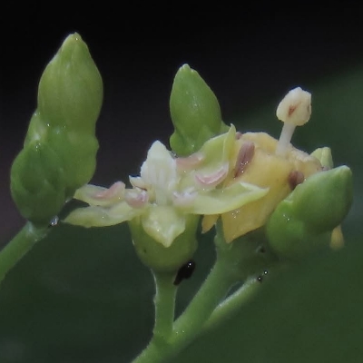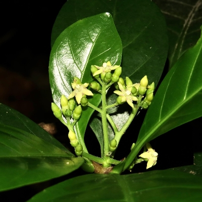 龍膽目〉茜草科 〉Rosenbergiodendron ==非台灣原生種== ●黑莓果(Rosenbergiodendron formosum) (栽培種;灌木或小喬木;高可達5公尺;葉對生,全緣;花白色,5瓣;漿果成熟後黃色,果肉黑色,可食,故名黑莓果) |